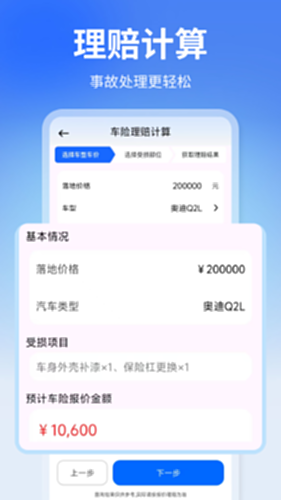 车险理赔,轻松计算,只需轻松输入车辆信息、基本情况、受损项目等,一键获取详细报价,直观对比价格差异,快速抉择,了解不同保险方案的性价比。