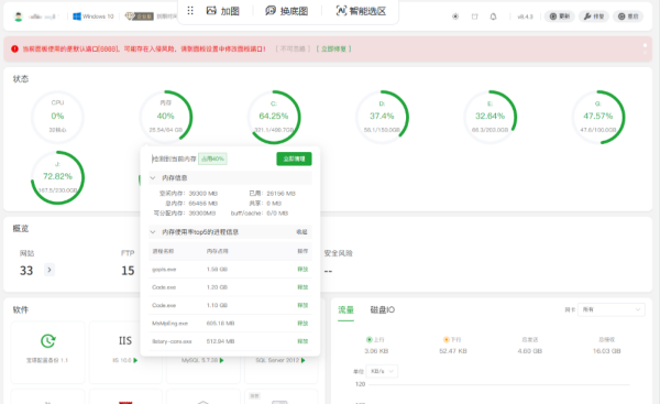 3、资源监控:软件实时监测CPU、内存、磁盘IO及网络IO数据,支持查看历史记录,掌握服务器状态。