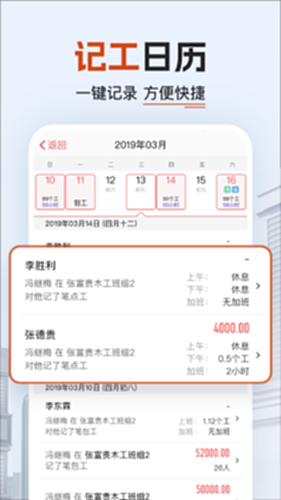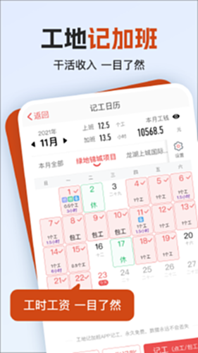 工地记加班供工地记工、记工天、记工时、记工表、记工本、记工表、记加班、工地考勤、员工考勤、记账本、工地借支等相关记录服务,让建筑工地办工,便捷服务,掌在手中: