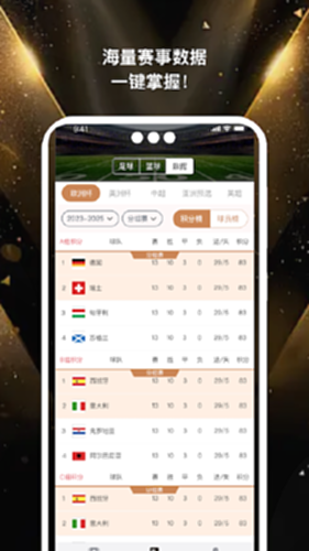 提供球队战绩、球员数据、历史交锋、积分榜、射手榜等详尽信息
