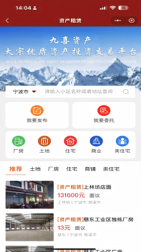 九喜资产是大宗资产交易的应用,包括二手买卖房源信息提供与交易服务、租赁房源信息提供与交易服务、新房信息提供与交易服务、商铺办公房源信息提供与交易服务、房屋出售出租委托管理服务、地块出售出租服务等