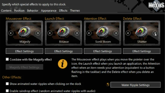 您可以调整停靠栏的位置、大小、透明度、颜色、特效等各种外观参数,还可以下载第三方主题。