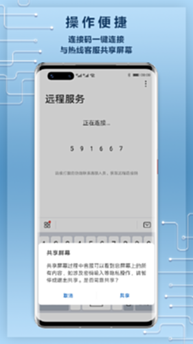 华为远程服务是一套 “客服远程桌面维护系统”,由用户端软件和客服端软件组成。用户拨打华为服务热线寻求故障帮助时,在用户授权分享的前提下,华为远程服务可连接客服和用户设备,使客服能够观察用户设备屏幕,远程辅助指导用户排查故障,精准判断用户设备问题,为用户带来更优质、更高效、更省心的售后服务。