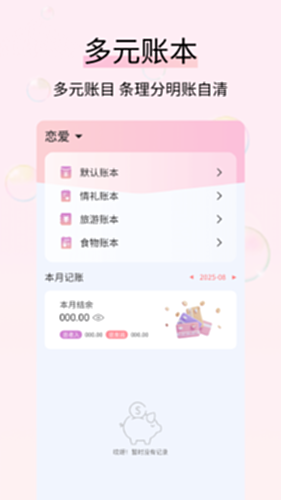APP 内置默认账本满足日常记账,另有情礼账本记录人情礼金、旅游账本追踪旅行花费、食物账本统计餐饮开销,分类清晰可查。