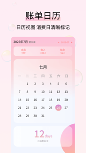 首页本月记账入口直观,点击即可快速添加收支。统计功能生成图表展示消费结构,日历功能支持按日期回溯明细。