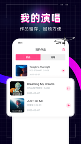 4.作品留存 :唱完后,歌曲将自动保存到你的作品库。你可以随时回顾自己的演唱历程,分享到社交平台,与好友一同回味精彩瞬间,展现自己的音乐成长与进步。