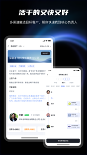为企业动态计算客户资源、触达路径,智能分析⼈脉资源合作机会,为企业打造智能“销售导航仪”,赋能业务员显著提升销售效能,帮助企业在商业拓展上显著降本增效,让企业线上开展B2B业务更加简单顺畅。