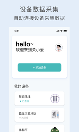 关小爱是一款配合智能设备使用的综合运动健康监测及医疗服务的APP,可连接关小爱全系列体脂秤、跳绳、血压计、胎心仪、血糖仪等设备,实时测量记录测量数据、运动数据、脉搏、血糖等,并根据这些数据提供科学的健康指导服务。