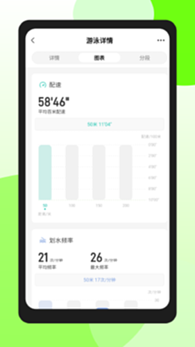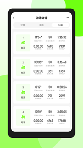 【游泳数据记录与分析】丰富的游泳数据记录分析维度,包括: 泳姿、总时长、热量消耗、划水次数、划水频率、趟数、百米配速、SWOLF、休息时间 让你全方面了解自己的运动表现,轻松找出下次游泳可提升优化的部分