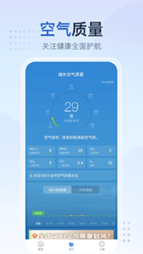 ③实时空气质量监测:认真呵护您的健康,实时更新空气质量、PM2.5等指数预报提供未来48小时及15天空气质量预报。