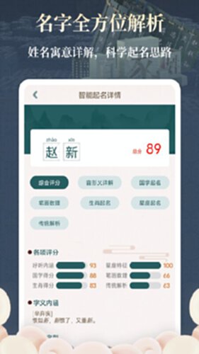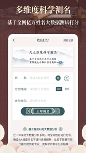 根据您设置的要求,比如宝宝的生辰、带某个字,就能获得你想要的名字,八个角度全方位解析名字,名字打分,姓名详解、说文解字、名字笔画解析、流行趋势、重名查询、音调解析、字形结构解析,读懂名字背后的寓意。