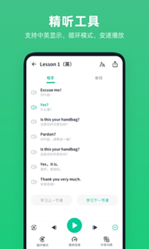 单句单篇精听,允许自定义播放语速、播放模式