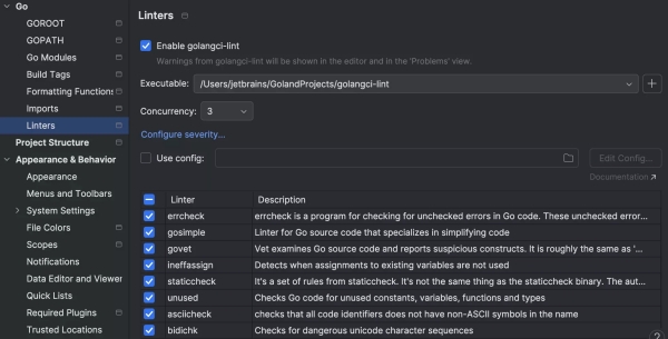 3、支持代码检查:GoLand2025官方版集成了Go Linter插件,支持golangci-lint配置,实时捕获潜在问题,让代码更完善。