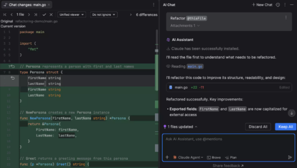 2、多智能体协作:JetBrains GoLand2025集成 Claude Agent 与 Junie,支持在同一聊天界面无缝切换,提供灵活的 AI 辅助体验。