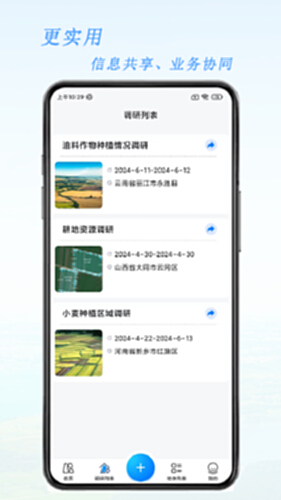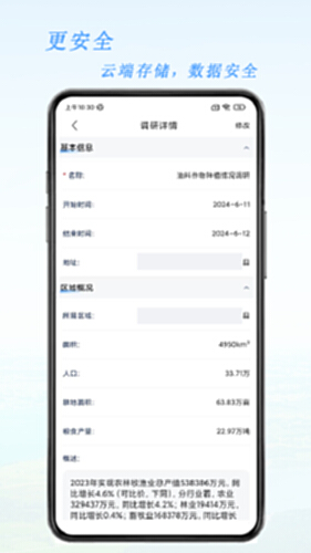 农业领域调研辅助软件,用于日常农业调研工作,查看调研区域的面积、耕地、粮食产量、农业概况等信息,记录调研现场情况,形成的调研报告,便于查看及分享。