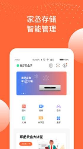 家丞存储App是一款配合家丞云盒的数据存储与操作、家庭影音娱乐和智能家居设备控制的应用,可以让你实现图片、视频等文件上传、下载,手机端的图片、视频等文件投屏到电视上,体验大屏的观感