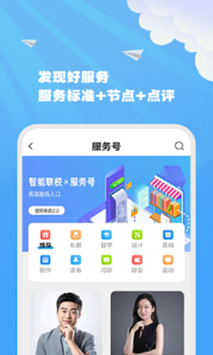 私教、督学、设计、营销、软件、法务、问诊、财会、咨询等高端服务都在智能联校。在智能联校享受高品质服务!