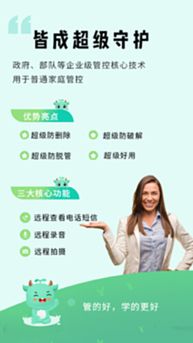 ★ 升级超级模式,将政府、军队等企业级管控核心技术用于普通家长守护,防删除,防破解,防脱管,真好用。