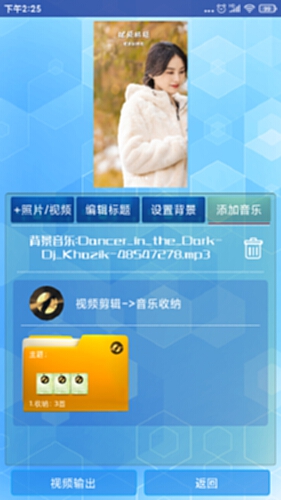 可编辑视频标题、视频副标题、设置视频背景图片、添加照片(拍摄或从照片收纳夹选择照片)、添加视频(录制或从视频收纳夹选择视频)、从音乐收纳选择音乐作为背景音乐,视频合成输出。