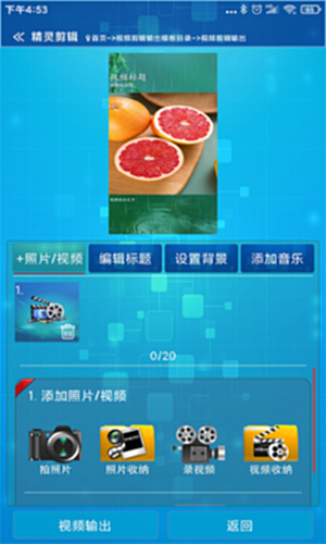 “精灵剪辑”是一款已经具有简单的UI程序界面,LitePal数据库操作,包含将照片、视频配乐剪辑合成视频输出、照片收纳、视频收纳、音乐收纳等功能的应用软件,该软件可以随时随地快速将照片、视频剪辑配乐合成新视频保存至手机相册,保留美好的记忆,通过照片收纳分类管理手机照片,并播放插入的手机音乐时浏览手机照片,通过视频收纳分类管理手机视频并浏览手机视频,通过音乐收纳分类管理手机音乐并播放手机音乐。软件界面简洁、操作简单。