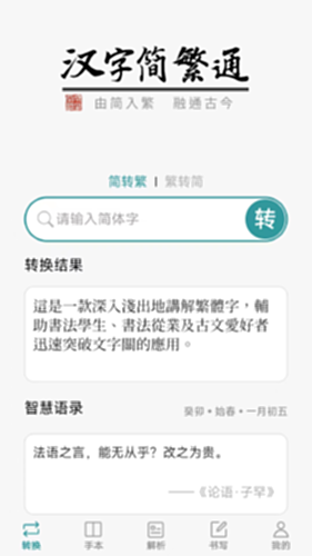 本app免费提供简繁字体互转,简繁转换本身存在上下文等因素的错误概率,没有任何一款能做到百分之百的准确。这也是有必要学习汉字本意的重要原因,一副字若出现错别字,观感就大打折扣了。另外了解汉字本意对阅读古籍能有更深层次的理解。