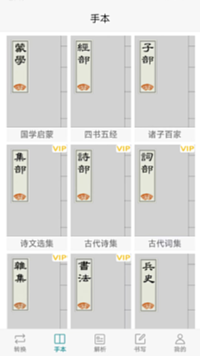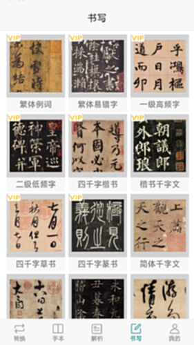 本app兼备三种字型的中国文化典籍,以传统古籍页面的手本提供阅读感悟、创作源泉。古籍封面提供书写练习,常用字以1875个左右的词组形式,收录约3750个,极少有重复。