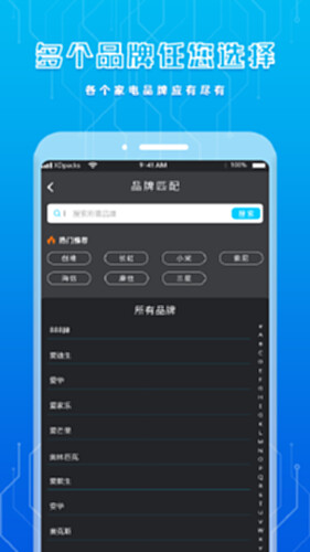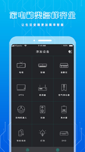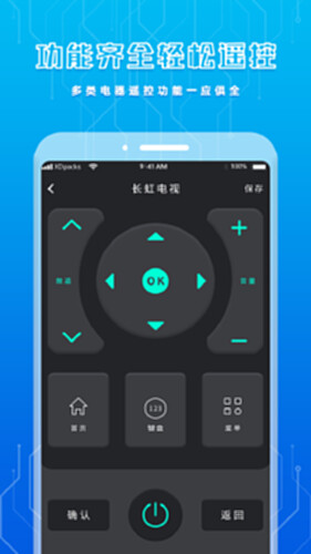空调遥控器简单界面展示,轻松连接,手机秒变空调遥控器,空调家电,一键遥控,常规红外线家电皆可遥控。空调遥控器把所有遥控器装进手机里,告别你的旧遥控器,迎接前所未有的智能遥控体验。 1.空调遥控功全面支持空调,电视,机顶盒/卫星接收机,投影仪,网络盒子,家庭娱乐设及其他红外设备。 2. 电视/机顶盒遥控器,看电视玩手机两不误,手机化身贴心的电视遥控器,内置电视节目表,轻松追剧,一键换台。 3.搜索空调遥控器一步到位:要找空调遥控器,直接输入电器品牌/型号等关键词搜索即可,一步到位,就是这么简单!