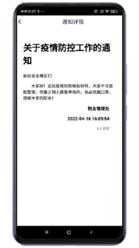 用户加入自己所在的小区,即可使用相关功能 1、首页 可查看当前小区的详细信息,以及物业日常发布的通知等内容 2、通讯录 小区常用电话记不住?通讯录帮你快速定位、使用,点击即可拨打 3、报修 日常使用的设备出故障了怎么办?动动手指,即可报修 4、圈子 闲来无事,聊聊小区发生的事情,大家来一起讨论 5、福利 通过完成积分任务,即可收获积分,兑换超值福利 6、建议 说出自己的想法,帮助物业更好服务小区居民