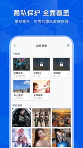 【私密相册】采用银行级加密技术,确保您可以安全地加密并保存私人照片、私人视频和重要文件;