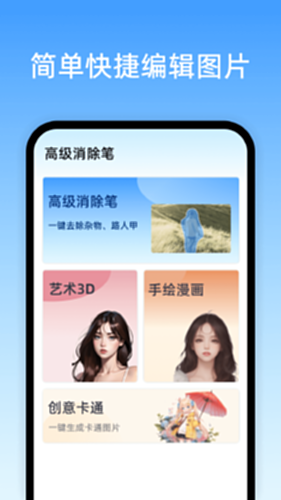 高级消除笔电脑版介绍:高级消除笔是一款功能强大的照片编辑APP,能够轻松去除照片中的瑕疵和不必要内容,例如多余的人物、背景等。此外,它还提供艺术3D、手绘漫画和创意卡通等特效,帮助您创作精美的图片作品。这款APP不断更新,未来将推出更多实用功能,满足您的多样化需求。