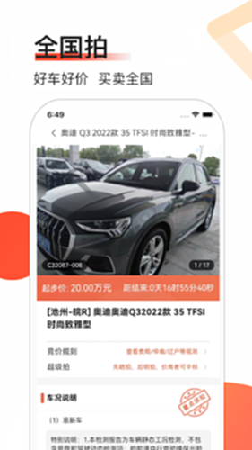 全国拍电脑版是一个由丰车信息技术有限公司打造的二手车全国跨区域拍卖平台,它整合资源,提供透明检测报告和高效交易服务,让用户(包括4S店经销商和竞价车商)通过缩短处置周期、提升成交价格、客观的检测报告和公正的出价过程,实现车辆的高效买卖,从而创建一个数字化、竞争充分、服务完善的二手车交易环境。