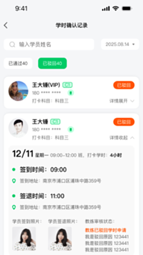 用于教练员app,可以查看自己所带学员记录,学车记录,可以审核学时的应用