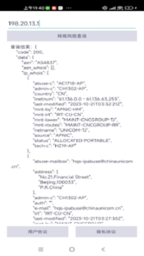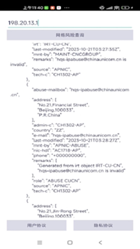 互联网用户上网数据采集与行为分析系统电脑版介绍:这款名为“iP查询”的APP是一款集IP归属地查询和网络测试于一体的便捷工具。它利用ip138专业数据库,为用户提供精准的IP归属地信息查询,并支持内部/外部IP地址及网址查询。用户可以通过ping、tracert命令进行网络诊断,获取SSID、BSSID、广播地址、网关、网络掩码等详细信息,还可以查看国家、地区、城市以及地理坐标。这款APP体积小巧,不占用过多手机内存,使用方便快捷。