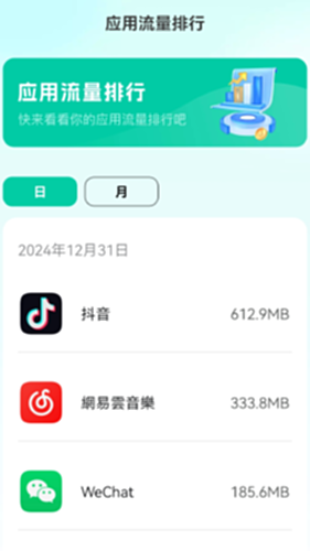 应用流量排行:提供详细的应用流量排行,让您清晰了解哪些应用消耗了最多流量,从而有效管理和优化使用习惯。