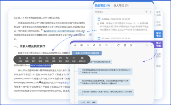 2、多元化笔记体系:知网研学支持摘录、划线、思维导图等多种笔记形式,构建个人知识体系,并支持笔记回顾与汇编整理。