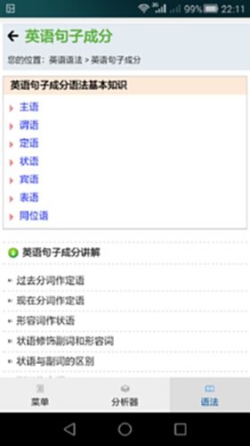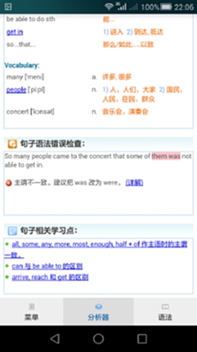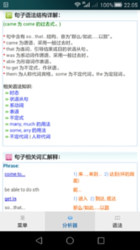 句解霸句子分析器App是一款在线提供英文句子分析的产品,由句解霸网站(www.en998.com) 出品。它能对任意输入的英文句子进行全智能的分析,并给出详细的分析结果。句解霸集多项功能于一身,其分析结果包括:句子成分划分,句子涉及语法点的解释,句子语法错误的检查和解释,句子词汇、词组、习语、结构、学习点的辨识和解释等。句解霸句子分析器兼有网页版和app版,用户注册后可以在手机、平板或电脑上使用。