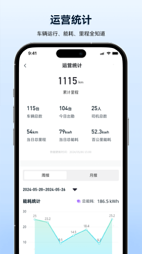 实时了解车辆状况,随时查看车辆当前位置,提提供车辆/车队运行数据统计,包括能耗分析、行驶里程、运行时长等关键指标。