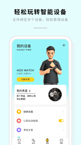 (3)智能设备管理:提供与AIZO关联的智能设备的管理设置功能,包括健康提醒、表盘更换、消息通知、来电提醒等。