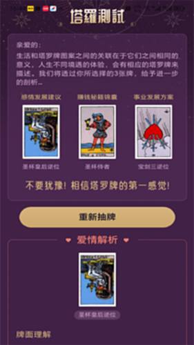 用户通过抽取三张塔罗牌,讲解爱情、财富、事业方面的详细信息,为用户带来人生的乐趣和愉悦的体验。用户抽取的第一张牌是爱情方面的牌意,用大约3分钟左右的时间,讲解用户关于爱情的当下和未来的展望。用户抽取的第二张牌是财富方面的牌意,用大约3分钟左右的时间,讲解用户关于财富的当下和未来的展望。用户抽取的第三张牌是事业方面的牌意,用大约3分钟左右的时间,讲解用户关于事业的当下和未来的展望。