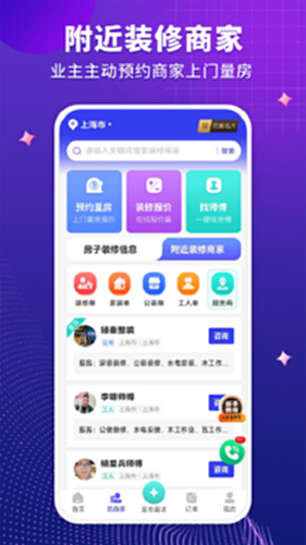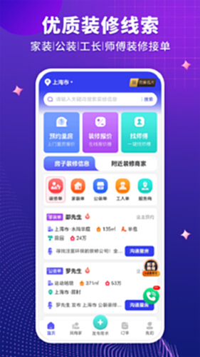 附近入驻的装修工长、装修施工队、装修公司上门量房报价,一键预算报价,业主根据自身选择适合自己的装修人来为自己做装修服务。产品推出即受到了广大用户欢迎,装修人产品受到装修业主及装修从业者的青睐。