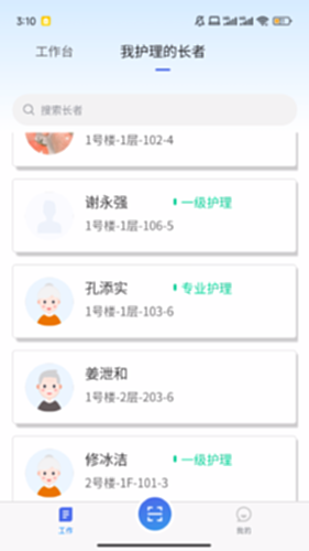 【扫码】:平台为方便护工能够迅速找到长者办理业务,提供扫码功能扫描长者二维码。