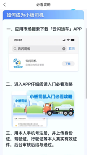 云闪司机,安全,高效,专业 ,一款基于大数据和云计算的公路运输平台。 安全:通过云闪司机,实现干线运输安全、高效、透明。 高效:通过云闪司机,实现干线运输效率、成本下降20%;同时解决司机的疲劳驾驶问题,支持司机小板抢单,导航出发,在线实时查看爱车位置,上传客户车辆图片