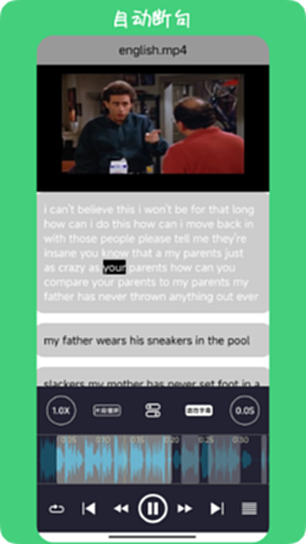 英语耳朵用于英语学习者,在学习英语听力时,可随心控制英语音视频语料播放的一款播放器类应用。支持主流音视频的播放,海量在线音频资源,AI提取多媒体字幕信息,AI学习讲解,跟读学习,AI英文文字/图片转音频,支持实时字幕跟进播放,支持手动选择自定义时段播放,支持自动断句,支持单句循环,支持快进快退操作,支持更改播放速度,实现字幕遮挡功能,实现听写模式查看比对等功能。