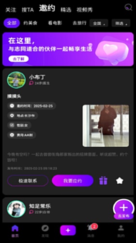 搜约app是一款爱好特长分享App,使用搜约app在双方认同彼此价值的情况下,可以自由平等的社交,在搜约app这里你可以邀请他人如咨询、运动、摄影、商演、主持和表演等合法活动。