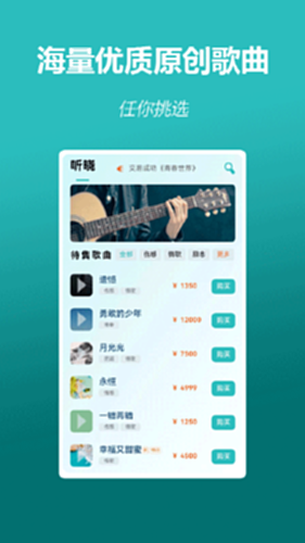 听晓,正规的买卖歌曲平台,提供优质海量的伤感流行、草原情歌、励志青春、说唱民谣、儿歌等风格的原创歌曲版权交易,是集买歌、录音、发行一站式服务网站,买好歌,上听晓。