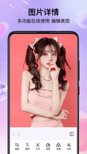 人像换背景:一键快捷换背景人物背景切换; 照片绘画:照片快速绘画,制作绘画照片; 图片编辑:图片在线一键编辑,功能全面; 图片详情:多功能在线使用,编辑美图。 更多等你来体验!