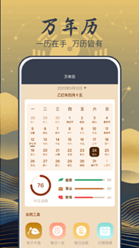 【万年历】 看农历;查黄历;知节气。择吉日,选吉时,赢先机。婚丧嫁娶,出行吉日,吉时吉历,一历在手,万历皆有。