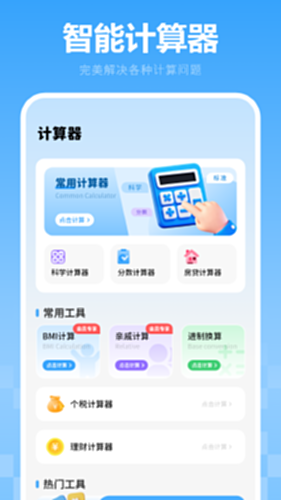 常用计算器、科学计算器、分数计算器、汇率换算、亲戚计算器、房贷计算器、五险一金、日期计算器、进制转换、理财计算、单位换算等为一体,功能强大,方便好用,简单解决各种计算、换算的多功能计算器。