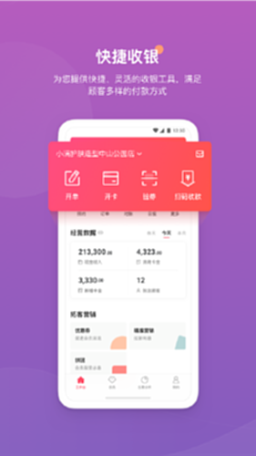 【快捷收银】能够满足顾客多样的支付方式,微信、支付宝、Pos机等,支持美团、大众点评团购验券。