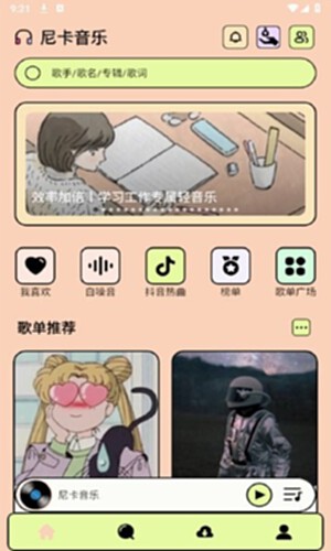 打开尼卡音乐app,可以看到我喜欢、白噪音、抖音热曲、榜单、歌单广场等栏目